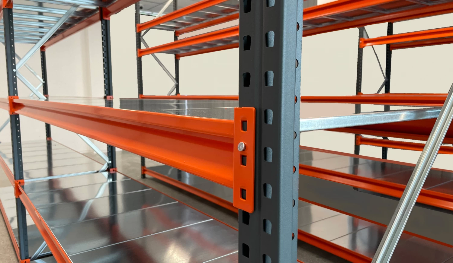 - Rafturi metalice Polirack™ pentru depozitare medie cu polite metalice incluse.